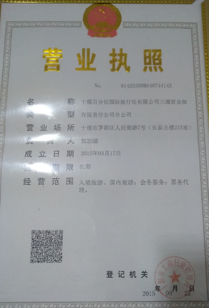 十堰百分佰國際旅行社有限公司是經(jīng)湖北省旅游局批準(zhǔn),在十堰市工商行政管理局注冊,并足額繳納質(zhì)量保證金、具有獨立法人資格的專業(yè)旅行社(營業(yè)執(zhí)照91420300MA4874414X),其前身為十堰旅游局下屬企業(yè)