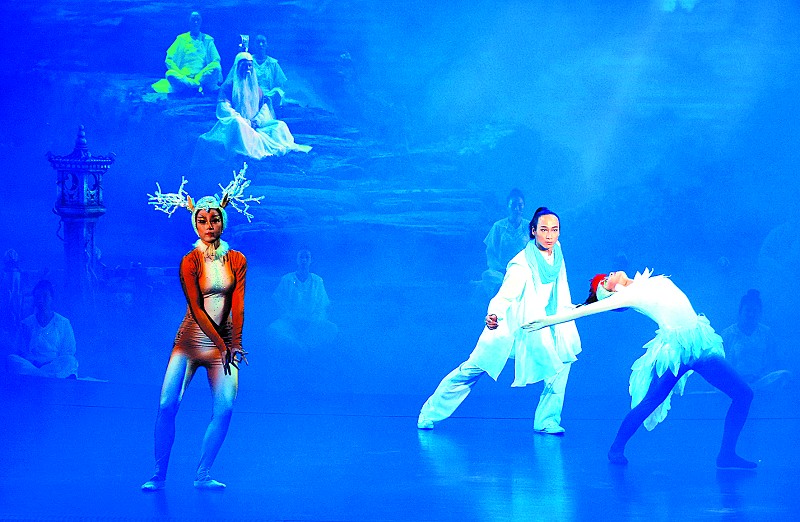 第一章《夢幻玉虛》夢幻神奇。當(dāng)追夢人叩開武當(dāng)山古老的山門時,舞臺呈現(xiàn)出電影《阿凡達(dá)》般的圣境,云霧繚繞,神鳥、仙鶴翩然飛過空中,梅花鹿、獼猴嬉戲于林間。觀眾仿佛穿越遠(yuǎn)古時代,跟隨追夢人一道去探尋武當(dāng)?shù)膴W秘。