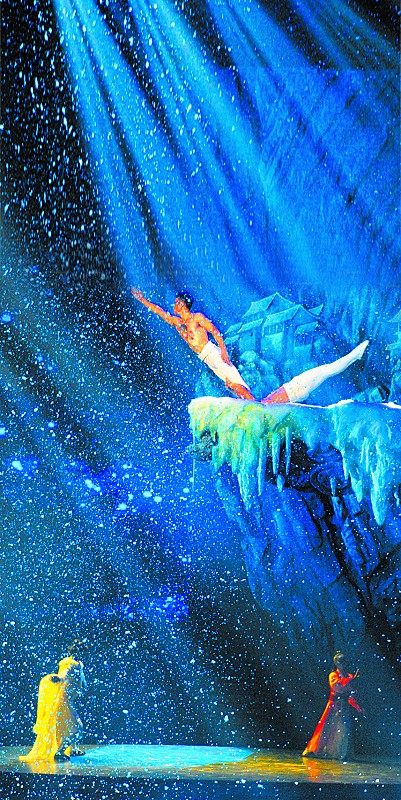 第三章《山水逍遙》唯美空靈。噴泉、水簾、水霧打造了一個夢幻的水屏幕,水霧碧波、細(xì)雨紛飛中紅傘飄過。追夢人和山水精靈情意綿綿,空中綢吊舞蹈唯美浪漫,令觀眾陶醉其中。