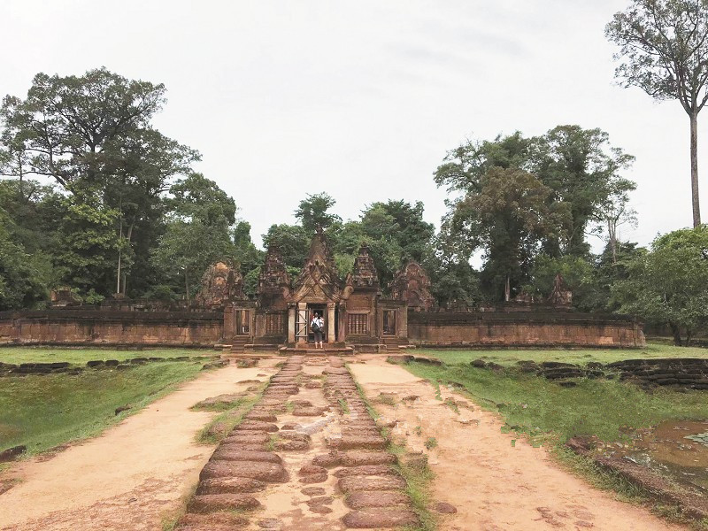 女皇宮又稱班蒂斯雷廟。據(jù)說,當(dāng)發(fā)現(xiàn)它的法國人第一眼看到墻壁上的美女雕像,還以為這是女皇所居住的宮殿,于是給其命名為“女皇宮”。其實,女皇宮是國王賜予他的國師的養(yǎng)老之所。女皇宮建于公元十世紀(jì),采用高棉特有的紅土建造,色彩極為艷麗。建筑學(xué)中的透視和對稱法則,成就了這座“叢林中的珍珠”。一連好幾道門,呈一條直線,越往里進(jìn),門的高度越低。學(xué)會低頭,學(xué)會俯身,學(xué)會敬畏,古人早就有了大智慧。