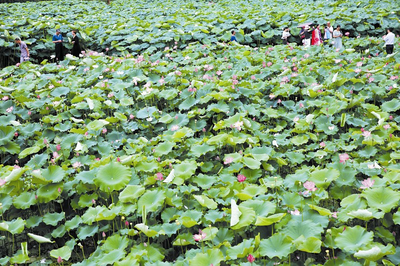 鄖西“相約七夕·天河水鄉(xiāng)”田園生活節(jié)期間,鄖西縣澗池鄉(xiāng)下?tīng)I(yíng)村淘寶小鎮(zhèn)荷塘音樂(lè)節(jié)再次成為鄖西人微信朋友圈的“網(wǎng)紅”?!俺酥苓叴迕?,還有來(lái)自陜西、河南、甘肅等地的眾多游客?!毕?tīng)I(yíng)村黨支部書(shū)記劉庭洲告訴記者,自荷花盛開(kāi)以來(lái),百畝荷塘每天吸引游客上千人,荷塘邊的農(nóng)家樂(lè)生意也跟著紅火起來(lái)。