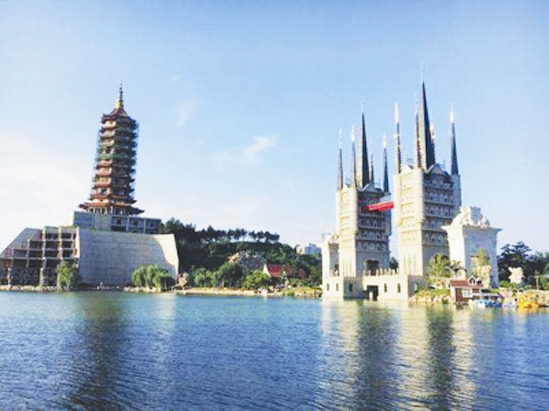 與湖這邊城堡、沙灘、鐘樓、荷蘭風(fēng)車等歐式建筑不同,園林、亭臺(tái)樓閣、萬佛塔、文峰塔、古城式的中式建筑讓整個(gè)學(xué)校畫風(fēng)突轉(zhuǎn),其中,雞鳴古城、萬佛塔與文峰塔是學(xué)校目前在建的重要工程。這三大工程無一不體現(xiàn)著甄忠義想要“集大成”的思想。