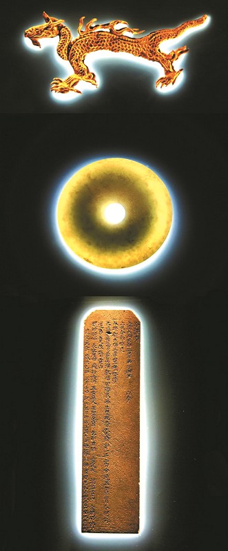 這三件文物是1982年出土的。當年8月5日,武當山紫霄宮賜劍臺下修公路時,由于山巖坍塌,扒出窖穴時,驚現(xiàn)埋藏的金龍一條、玉壁一件、山簡一枚。專家考證,這套文物屬于建文元年(1399年)。一直以來,考古專家們都將建文年間的文物視為“稀世珍寶”。因為,建文帝在位僅四年,而這些文物恰好填補了考古學界的空白。