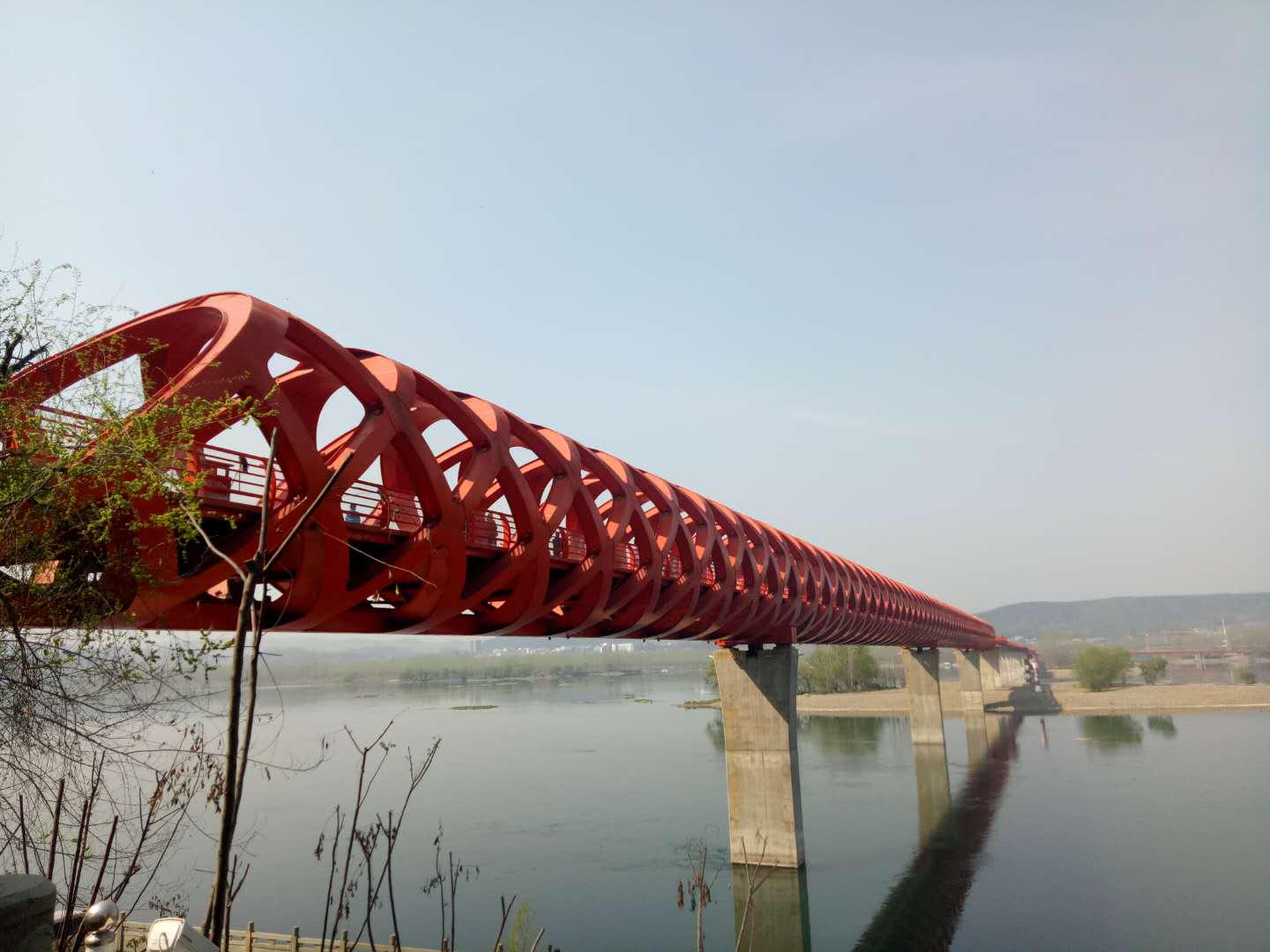 網(wǎng)紅橋由56個(gè)紅色鏤空鋼桁架環(huán)拼接而成,象征56個(gè)民族堅(jiān)定不移跟黨走,攜手共筑“中國(guó)夢(mèng)”;引橋長(zhǎng)1030米,采用35米簡(jiǎn)支鋼箱梁,同時(shí)加寬3跨至11米作為觀景平臺(tái),觀景平臺(tái)和連接江中沙灘島嶼通道,登上大橋可觀“一江碧水穿城過(guò)”美景,游生態(tài)濕地公園,享親水休閑生活。