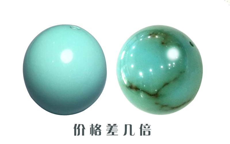 1,光澤度高。有一種玻璃光澤的效果,反光強(qiáng)烈,低瓷的綠松會(huì)黯淡很多,沒有珠光寶氣的感覺。