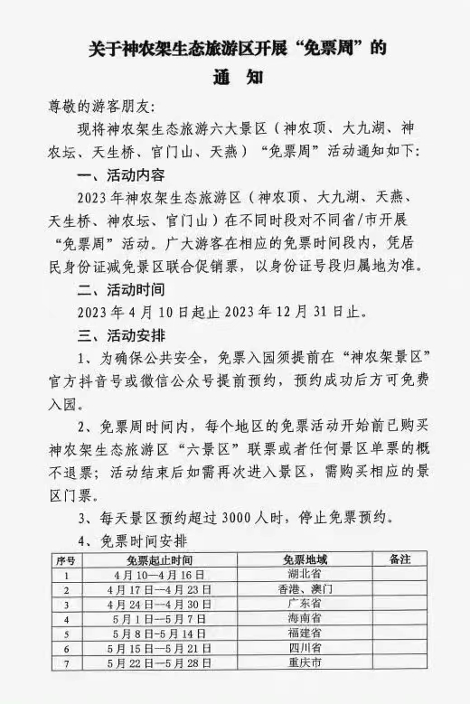 為了促進(jìn)神農(nóng)架旅游經(jīng)濟(jì)發(fā)展,特推出神農(nóng)架門票“免票周”,面向全國客大城市推出免票政策。2023年神農(nóng)架生態(tài)旅游區(qū)(神農(nóng)頂、大九湖、天燕、天生橋、神農(nóng)壇、官門山)在不同的時間段針對不同省/市開展”免票周“活動。廣大游客在相應(yīng)的免票時間段內(nèi),憑居民身份證減免景區(qū)聯(lián)合促銷票,以身份證號段歸屬地為準(zhǔn)。